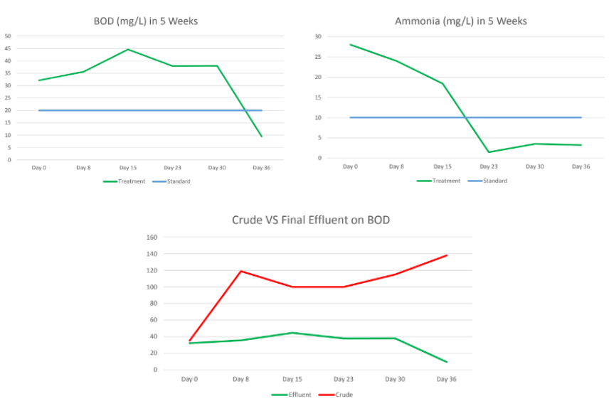 During pre-treatment monitoring, we noticed that the AquaBio Solution could help the sewage treatment plant meet the standard of Final Discharge as regulated by the Department of Environment (DOE). After about 30 Days of enhancing phycoremediaton and bioremediation, the standard effluent quality was achieved.